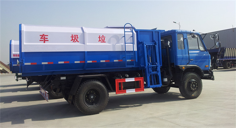 工作原理:自裝卸式垃圾車是由密封式垃圾廂、液壓系統、操作系統組成,能配幾十個垃圾桶,實現一車與多個垃圾桶聯合作業,廂體上的液壓升降裝置可將垃圾桶吊上、放下,上下升降,上下一次工作循環時間為50S,密封式廂體環保衛生,可避免二次污染。其自裝式的掛桶裝置可直接將路邊的垃圾桶掛在上面用提升機直接到在垃圾箱體里面省去了裝垃圾的麻煩。
